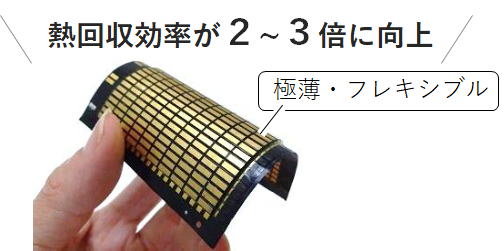 ![]() フレキシブル熱電発電モジュール「フレキーナⓇ 」 (特許第5228160号、US特許も取得) |